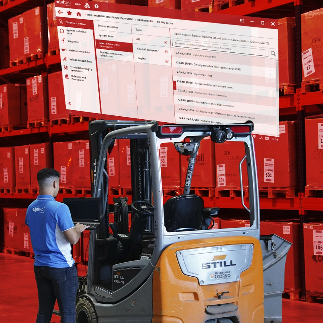 Jaltest MHE (Material Handling Equipment) es el módulo de Jaltest Diagnostics pionero en el ámbito de la reparación de equipos de manejo de material como carretillas elevadoras, manipuladores telescópicos, plataformas elevadoras y derivados.